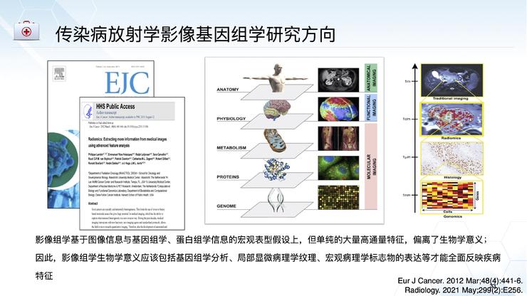 传染病放射影像学基因组学,它是基于图像信息与基因组学信息,蛋白质组学信息的宏观表型假设,但单纯的大量高通量特征偏离了生物学的意义。