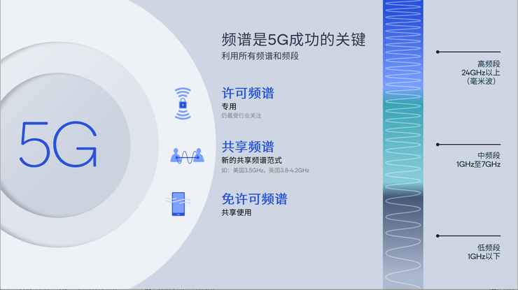 频谱是推动5G演进、实现5G成功部署的关键。与前几代移动通信技术不同的是,5G从设计之初就覆盖了多样化的频谱,包括许可频谱、共享频谱以及免许可频谱。从目前全球频谱规划情况来看,5G频谱使用具有显著的多样化,包括中低频段与高频5G毫米波的互相配合和补充,中低频段支持更多、更广泛的覆盖,毫米波支持超高速率、更低时延。充分开发和利用各类频谱,发挥最大的效率和效益,能够全面释放5G潜能,从而实现5G的全部愿景。