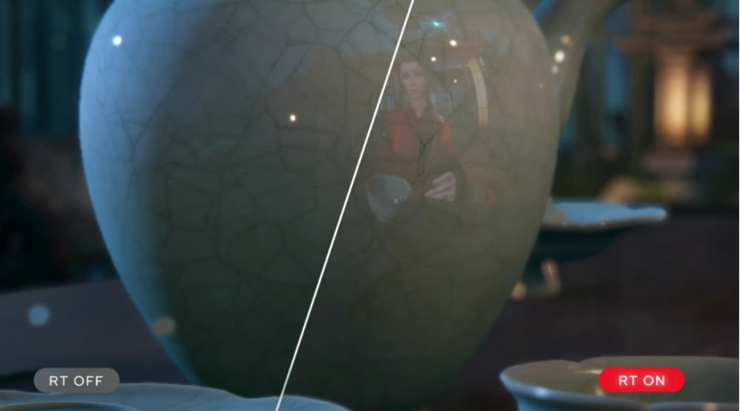 光追特性关闭和开启后游戏画面中瓷瓶表面反射对比