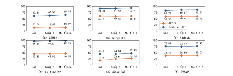 图 6 中观察了对六个不同算术数据集使用单一条件掩码的效果:由于这些数据集输入中的每个数字都可以被视为一个条件,因此可以研究增加验证条件数量的影响。经大多数实验可发现,多条件掩码比单条件掩码表现更好,并且都比原始 CoT 表现更好。