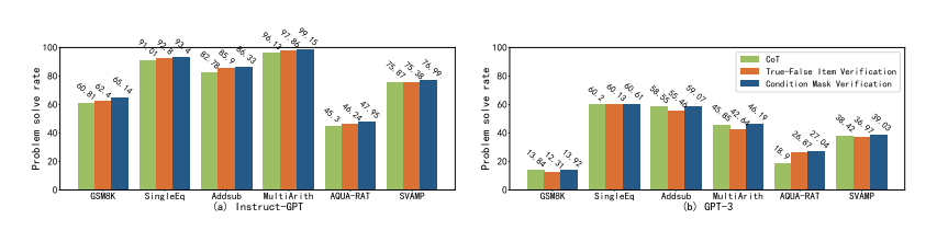 图 10:6 个算术数据集的问题解决率(%)条件掩码验证和真-假项目验证的比较