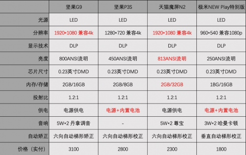 今天我就拿了四台目前市面上主流的1800-3000价位的四款投影仪,从使用便利性和画质、色彩等硬指标方面进行对比。它们分别是坚果G9、坚果P3S、天猫魔屏 青选N2、极米NEW Play特别版。