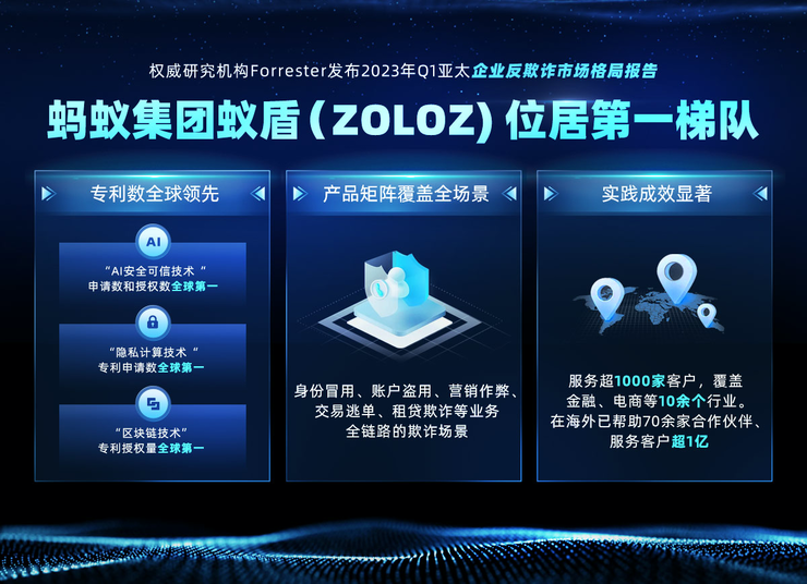 近日, 国际权威研究机构Forrester发布《 2023年第一季度亚太企业欺诈管理格局报告》(The Enterprise Fraud Management Landscape In Asia Pacific, Q1 2023),蚂蚁集团被列入第一梯队,即近一年收入规模超3000万美金的厂商。
