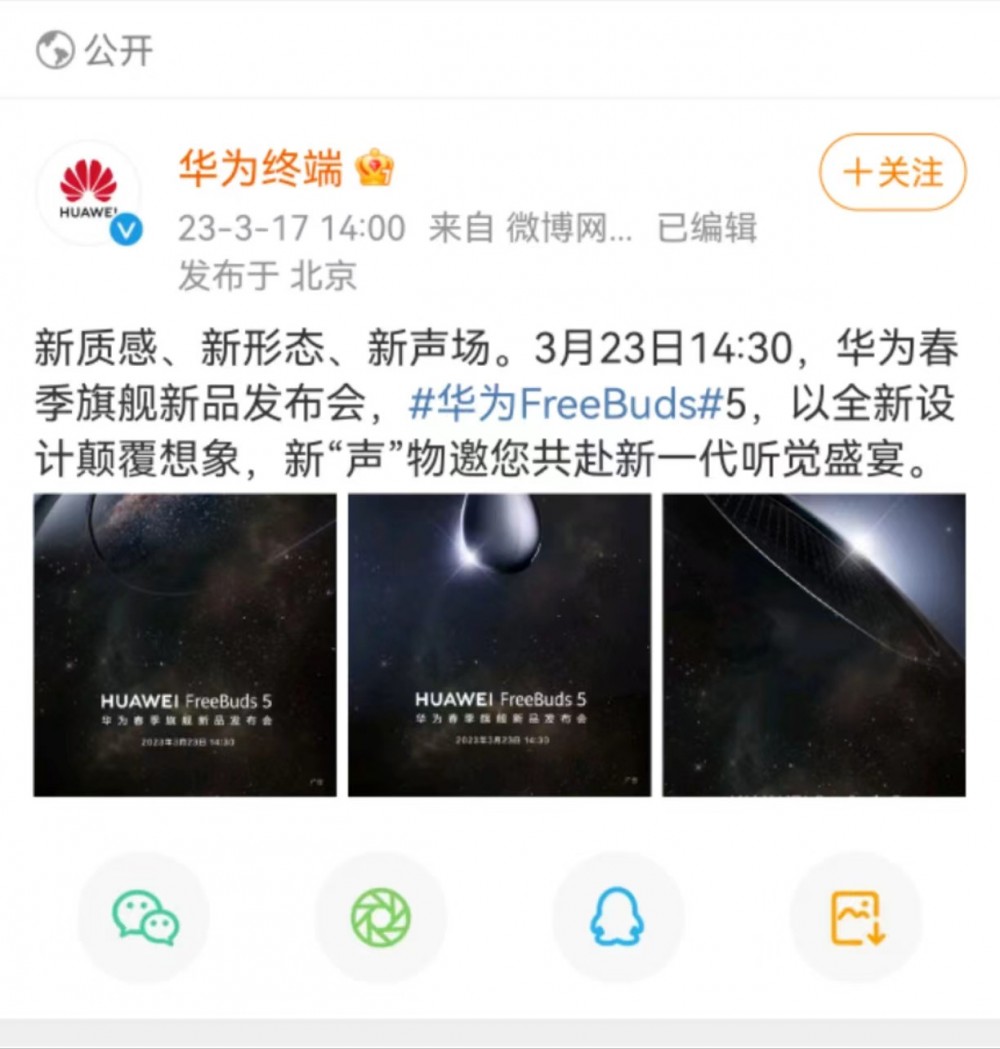 3月17日,华为连发三张概念海报,宣布将于3月23日的春季旗舰新品发布会,推出新一代半入耳旗舰TWS耳机FreeBuds 5。目前,市场上已许久未见高端半入耳耳机的新品推出,而华为