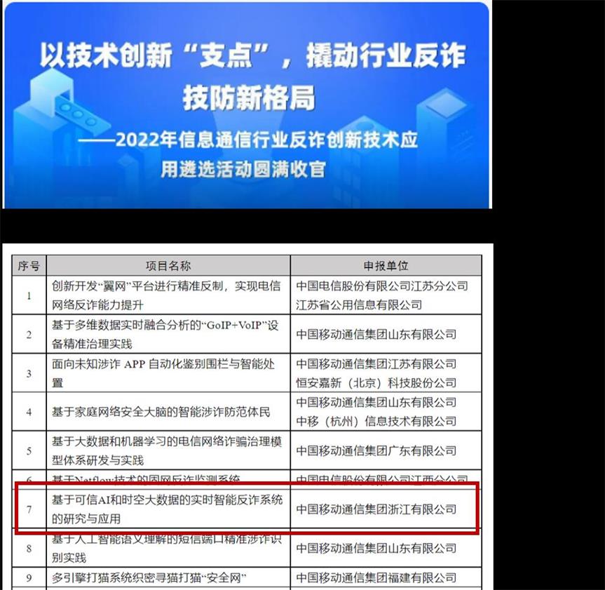 日前,工业和信息化部网络安全管理局发布2022年防范治理电信网络诈骗创新技术应用遴选优秀项目名单,邦盛科技参与承建的中国移动通信集团浙江有限公司(以下简称:中国移动浙江公司)的“基于可信AI和时空大数据的实时智能反诈系统的研究与应用”项目成功入选。