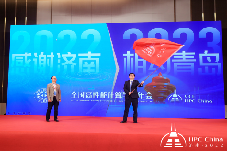 随后,青岛国实科技集团有限公司高级总裁谭华登台正式接过CCF HPC China会旗。谭华总裁对此表示,国实集团是国产超算领域的新兵,致力于国产超算领域的发展和应用。欢迎各位专家领导在今年共聚青岛,续写算力行业发展崭新篇章,为CCF HPC China留下属于青岛的印记。至此,本次第十八届CCF全国高性能计算学术年会颁奖典礼圆满落幕,不忘过往成绩,期待未来发展,面对时代的需要和新的挑战,每一位行业人都将再次启程。
