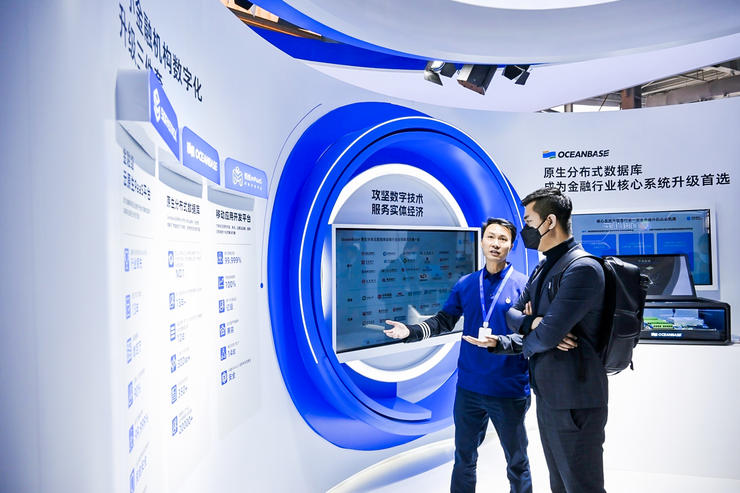 在蚂蚁展区,“数字化三件套”科技产品尤其让人关注。蚂蚁集团持续投入研发的云原生PaaS平台SOFAStack、一站式移动开发平台mPaaS以及原生分布式数据库OceanBase,作为“中小金融机构数字化升级三件套”再次亮相,又带来新的创新成果。