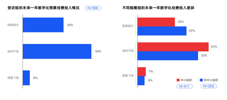 对于公益数字化的未来规划与发展,《报告》显示,受访组织未来一年的数字化预算呈稳中有升的趋势:59%的组织愿意保持当前的投入,另有35%的组织将提升数字化经费预算,用于购买标准化付费产品、加强专业数字化人才建设。这预示着公益数字化的良好发展势头。