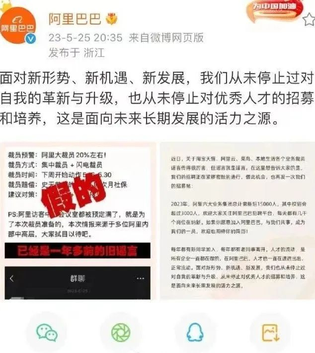阿里巴巴集团官微宣布,2023年六大业务集团总计需新招15000人,其中校招超过3000人。同时表示,“近日,关于淘宝天猫、阿里云、菜鸟、本地生活各个业务裁员谣言传得很厉害,但谣言就是谣言。我们的招聘正在紧锣密鼓的进行。”(智次方)