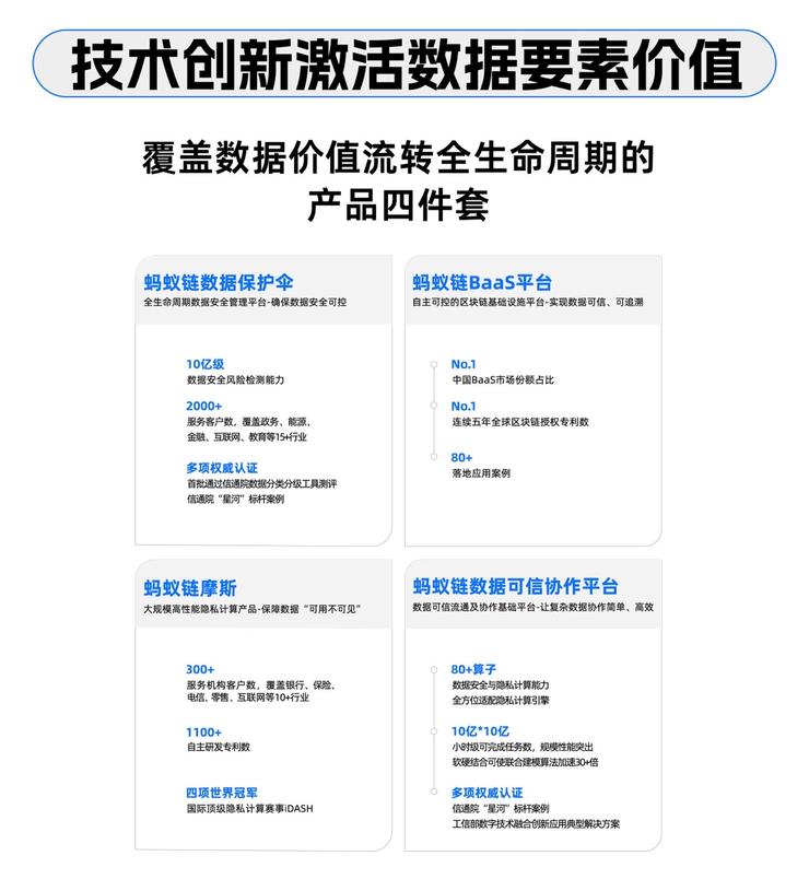 在数博会展区,记者看到蚂蚁数科推出数据要素产品四件套——全生命周期数据安全管理平台数据保护伞、自主可控区块链基础设施平台BaaS、大规模高性能隐私计算产品摩斯、数据可信流通及协作平台FAIR,它们分别解决数据流转的安全管理、可信追溯、可用不可见、高效协作四大核心问题。