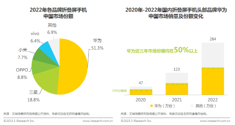 今年3月,国内知名调研机构艾瑞咨询发布《2023年中国折叠屏手机市场洞察报告》。报告内容显示:近三年来,在智能手机市场持续低迷的大背景下,只有折叠屏手机凭借创新性的形态和沉浸式大屏体验实现逆势增长。