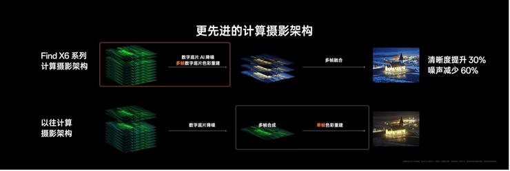 同时,Find X6 系列还带来移动影像计算架构的一次重大革新,不仅将传统降噪的计算以先进的 AI 算法应用在信息量最丰富的数字底片,更将传统的单帧色彩重建算法重塑为多帧色彩重建算法,并前置应用于数字底片。