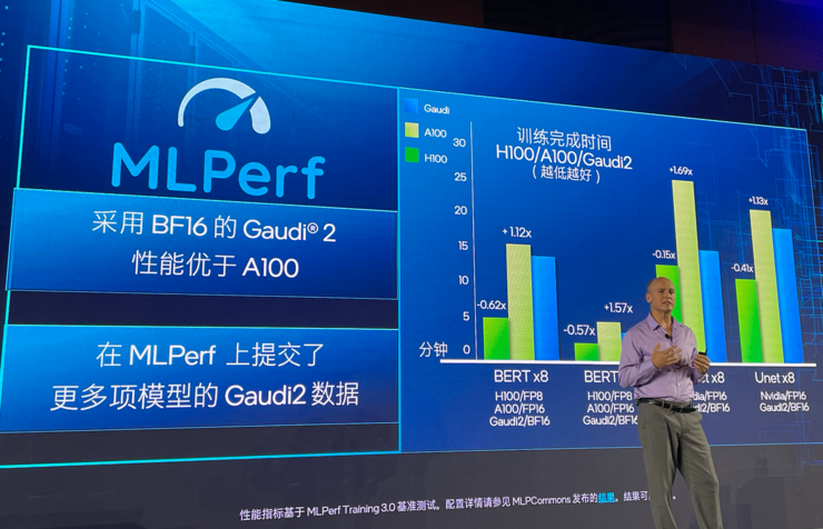 2022年的英特尔On产业峰会上,英特尔发布了新一代高性能深度学习AI训练处理器Habana Gaudi2,那时的Gaudi2训练BERT模型的性能相比英伟达A100就有2倍的性能优势,广受关注。