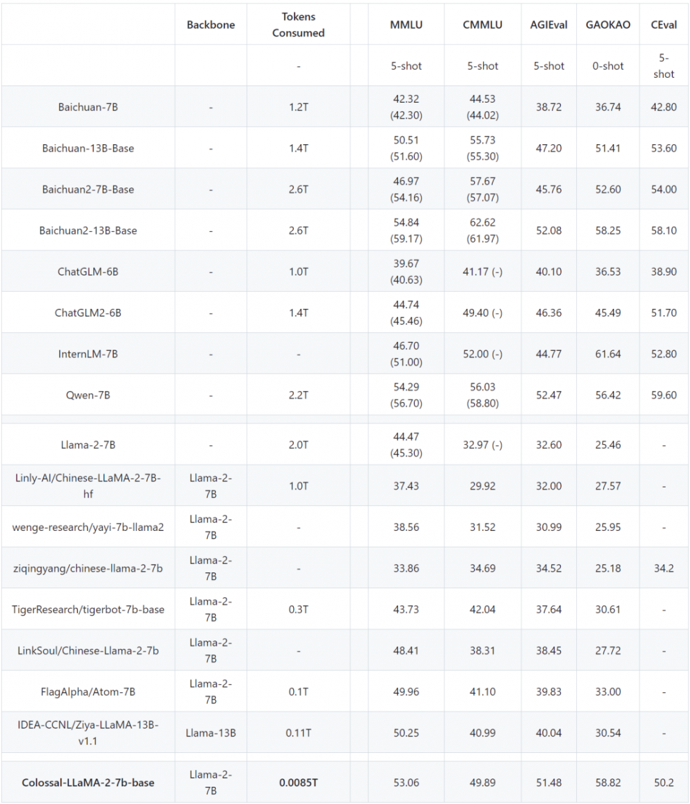 注:基于ColossalEval评分,括号中分数来源于对应模型官方发布的榜单分数,C-Eval 分数来源于官网 Leaderboard。