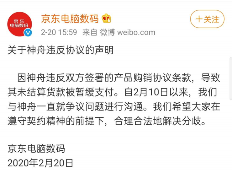 对此,“京东电脑数码”很快也在微博发表声明回应,称“因神舟违反双方签署的产品购销协议条款,导致其未结算货款被暂缓支付。”并表示,自 2 月 10 日以来,一直就争议问题与神舟进行沟通。希望大家在遵守契约精神的前提下,合理合法地解决分歧。