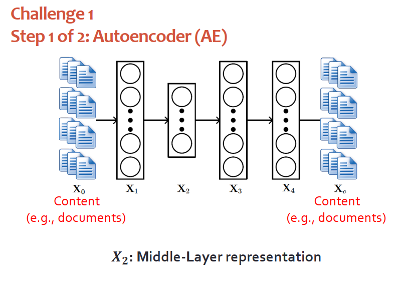 来看第一个挑战。自编码器是很简单的深度学习模型,一般会被用在非监督的情况下提取特征,中间层的输出会被作为文本的表示。值得一提的是,中间层的表示它是确定性的,它不是概率型的,和图模块不兼容,无法工作。