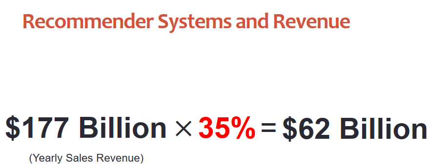 推荐系统性能提升能够提升企业利润,根据麦肯锡咨询公司的调查,亚马逊公司中35%的营业额是由推荐系统带来的。这意味着推荐系统每提升1%个点,都会有6.2亿美金的营业额提升。