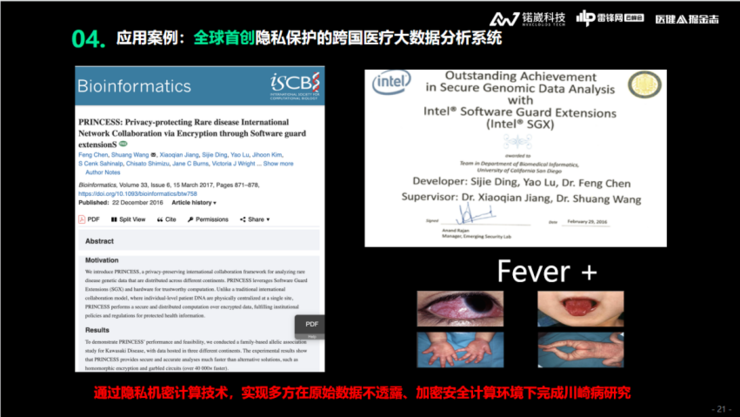 此外,我们也做了一些其他应用,比如通过隐私计算帮助儿童罕见病网络进行带有隐私保护的查询和临床辅助诊断系统的应用,通过隐私计算实现对于输入系统的患儿基因信息、临床诊断信息等查询条件的保护。