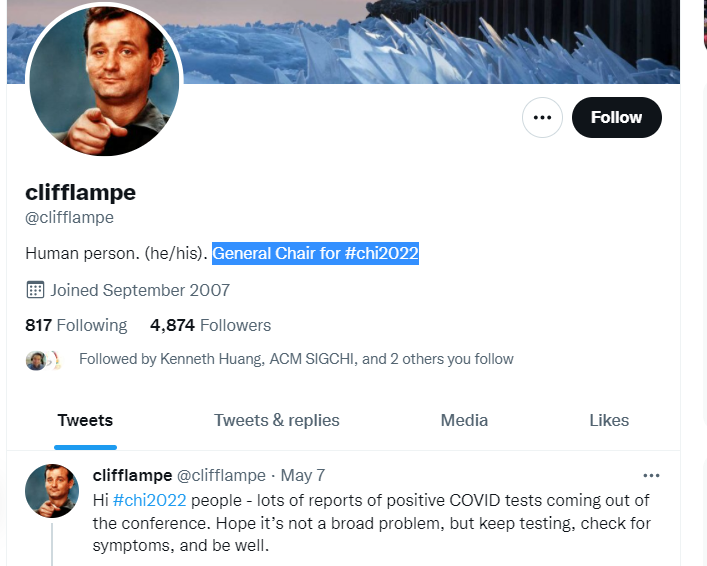 事情非常严重,考虑到新冠的传播性,推测不会只有少数学者中招。对此,CHI2022会议的主席在5月7日发推表示:大会上有很多关于新冠阳性的报告,希望这不是大面积发生的,大家要继续测试,检查症状,然后康复。