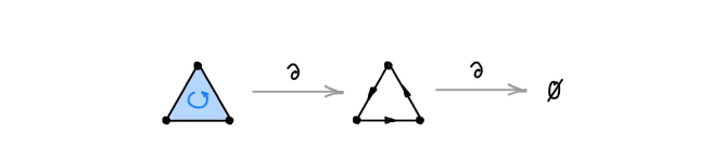 图注:应用于 2-单纯形的边界算子产生一个三角形。再次将算子应用于三角形,结果为零,由于三角形是一个循环,因此它没有边界。